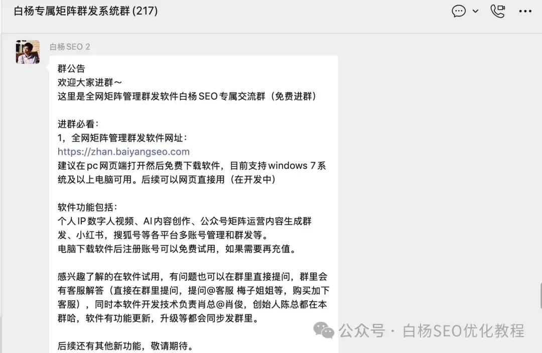你可能会问,如果想要试用,或者买了不会用,或者有问题怎么办?白杨SEO建了一个这个工具的专属交流群,创始人陈总,肖总都在群里,还有客服等。如图,