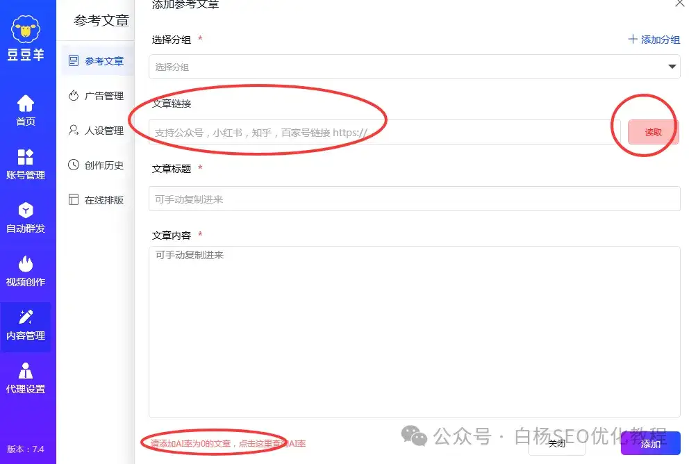 参考文章主要目的是给AI看的,这个豆豆羊接的是国外最先进的AI大模型API,不管你是公众号文章还是小红书图文还是知乎链接都可以。它会自动读取。