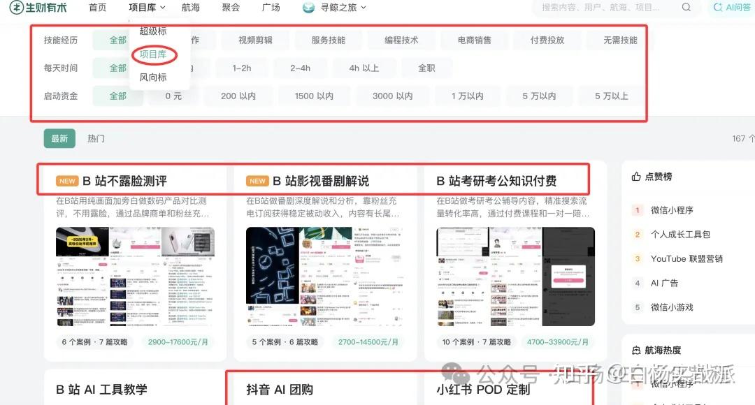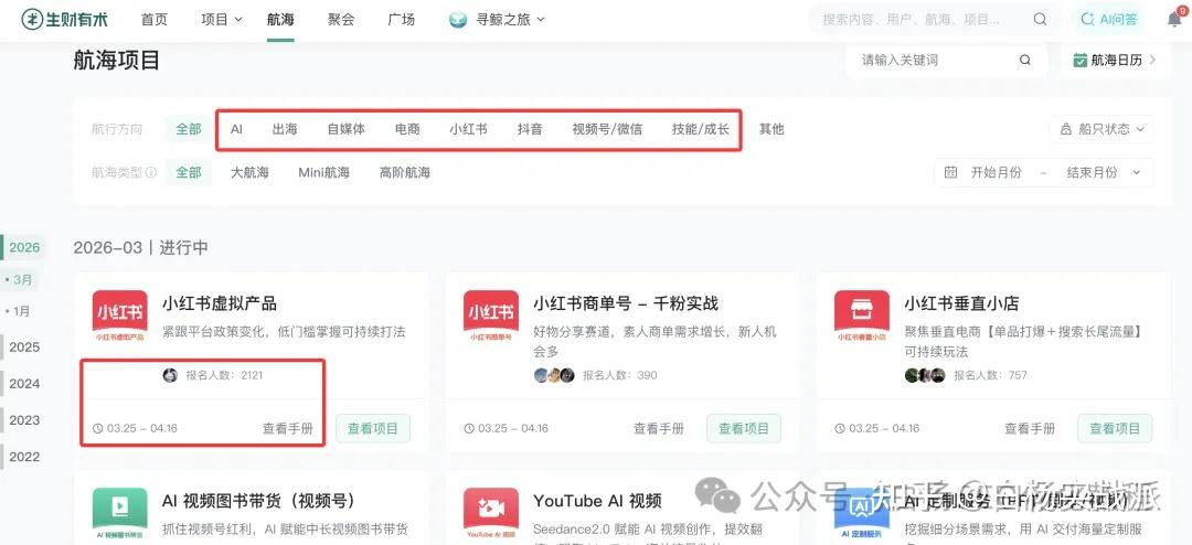 航海实战:这是重头戏。每月有各种实操项目(小红书、AI编程、出海、视频号等),报名需交199元保证金,完成12次打卡全额退还。相当于免费学,但用押金倒逼你行动。