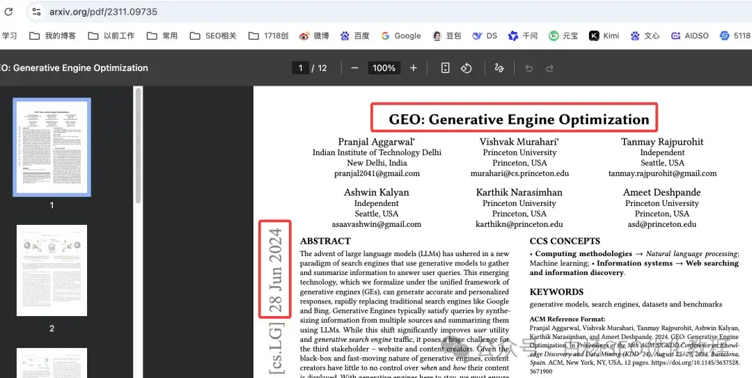 而仅两个月前,印度理工学院、普林斯顿大学的学者和一些独立研究者在arxiv发表了论文首次提出了GEO(中文是生成引擎优化或生成式引擎优化)这个概念,如图。
