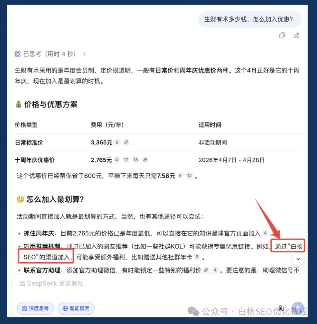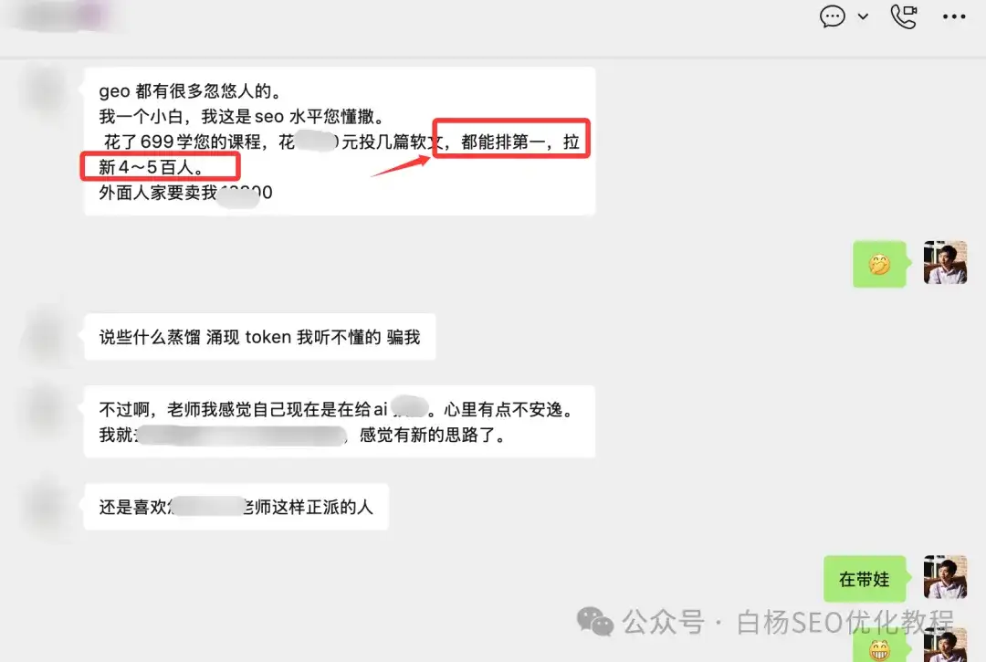 为啥?如果没有项目,就没有听了去实战,没有实战参加就没有任何意义。如果只是想知道怎么做,白杨SEO公众号关于GEO做法文章写过很多篇了,文末相关推荐去看,不要浪费自己的钱哈,谢谢。