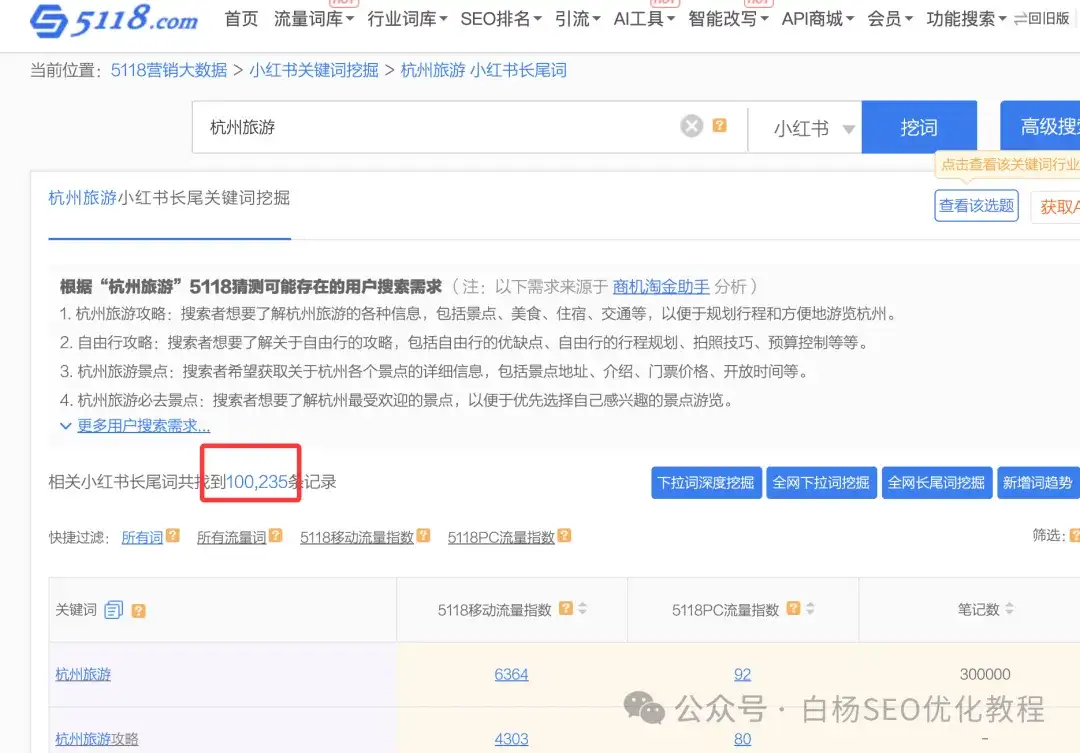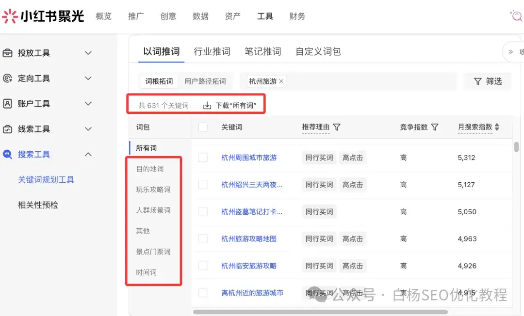 所以我们去找精准需求,可以去第三方工具小红书分类上挖掘杭州旅游的长尾词,当然最好是用聚光把杭州旅游相关的词全部下载下来。