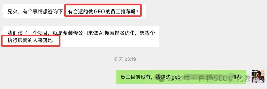 PS:如果你是GEO从业者或者有经验要找工作或兼职也可以加白杨SEO微信,因为现在这类需求也多啊,我做训练营也希望为行业做一点点小贡献。