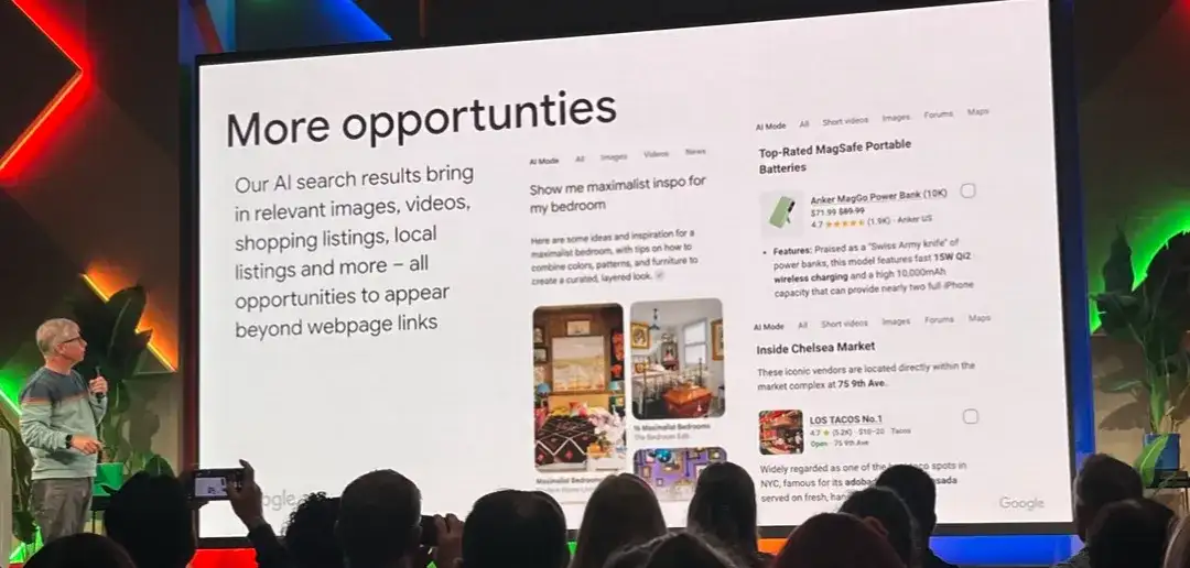 AI 搜索中会有很多新机会,比如相关图片、视频、购物列表、当地列表等。