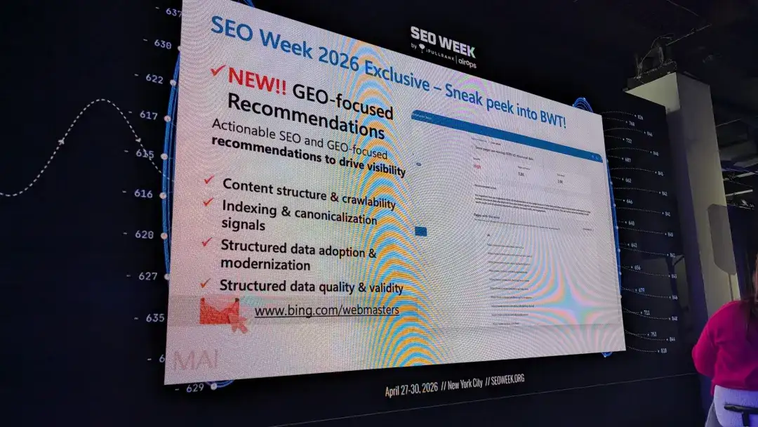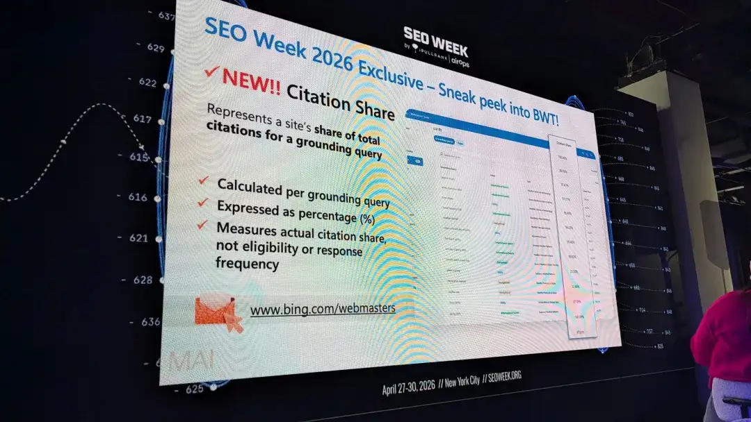 Bing 站长工具已有 AI 搜索的数据报告(这部分已经领先 Google Search Console),本次在 SEO WEEK 2026 大会上又预告了新的功能。