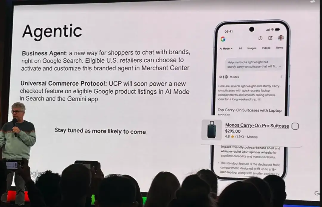 - 通用商务协议(UCP,Universal Commerce Protocol):即将为符合条件的 Google 商品列表提供全新的结账功能支持,覆盖搜索中的 AI 模式(AI Mode)以及 Gemini。