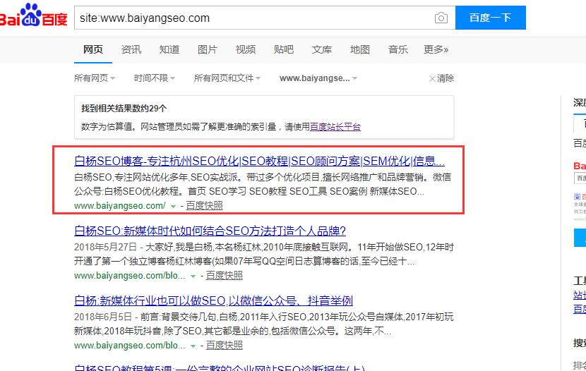 OK,白杨再次说下,也可能还有别的情况。上面这几种呢也只是参考 。比如A点提到的site不在首页,以前百度官方也说过不用太在意的。再说,网站流量减少,那有可能是季节性原因呢,还是什么,一定要去看数据。不要什么情况一来,肯定降权了,然后病急乱投医。没找到病因,胡乱吃药,那只会越医越病!那我们接着往下看。