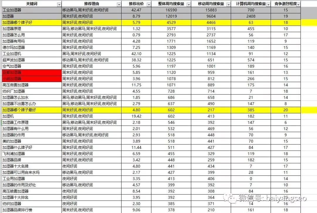 词挖掘好了,咱们还得整理,怎么整理,就是找价值高的词,同时与业务最相关的词,比如我这个是办公司的,所以我后面还下载了办公司加湿器这样的。